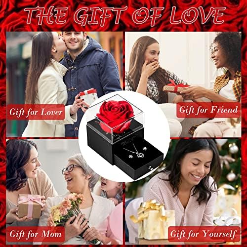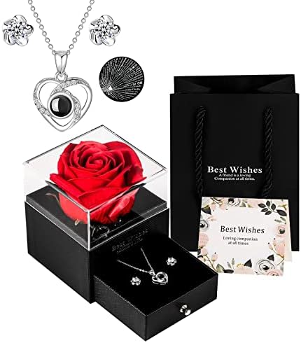 ????Luxury Rose Flower Gift Set: Eternal rose gift set includes: 1 Preserved Eternal Rose + 1 Jewelry Box + 1 sterling silver heart Necklace + 1 Gift Bag + 1 Greeting Card (with Envelope). This complete set makes a beautiful luxury present. Give her the gift box, Tell her that the eternal flower represents “eternal love”, “eternal happiness” and “beautiful eternity”. let her guess what’s in the drawer, and write a little message on the cute card if you like.
