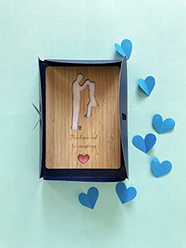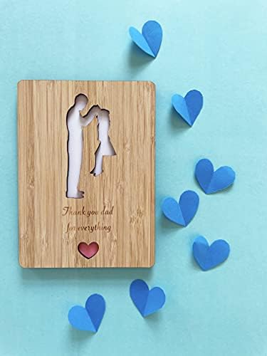 WOODEN BAMBOO CARD- Handmade sentimental unique gift for dad on father’s day from daughter. Designed as a beautiful keepsake that is often left open for display, a gesture of your love, a special gift stored for memory forever. PACKAGE INCLUDES – Handmade Bamboo Card with engraved “Thank you dad for everything” with a cut out design of dad holding daughter up by hands and a small pink heart (11x15cm). Exquisite 3-D structured blue love heart envelope. Inner sheet design with small heart and balloons in the corner of card with a blank area in the middle to leave a handwritten message. DESIGN ELEMENTS -This elegant card is designed intricately with the tiniest detail in mind. From the design of dad holding daughter up by hands to the cut out pink heart, to the inner sheet design and the unique 3-D folded blue love heart envelope. ELEGANT GIFT- Special design bamboo card creates an exquisite gift for father’s day. Perfect for a thoughtful, elegant and sentimental gift. Can be given as a token of your love for any occasion including, father’s day, birthday, get well soon, or just as a thank you card suitable for any day. QUALITY MATERIAL- 3mm Bamboo, Envelope is made from a premium high quality glitter coated card.”