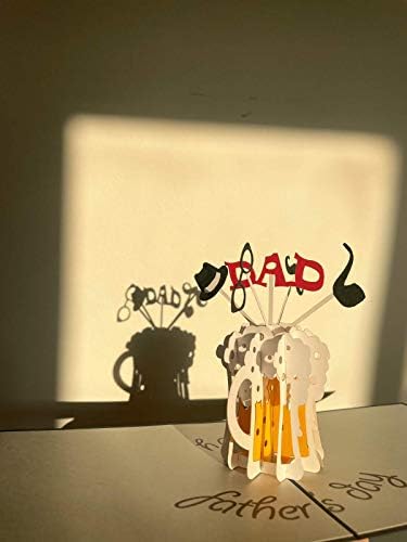 FATHERS DAY CARD -The front of this pop up card features a “Fathers Day” greeting text with sunglasses and moustache. Once opened, a beer pint pops open to 3D life, with the foam dripping from pint. This 3D card is designed to delight and surprise the recipient.
