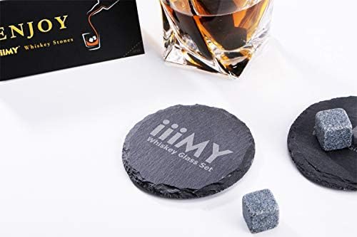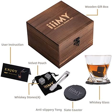 Package and Warranty: iiiMY Whisky Glass Gift Set contains 1 twist whisky glass, 4 whisky stones and 1 natural slate coaster. A velvet pouch and an rubber-end tong made of 304 stainless steel are included as gifts. Customer has 100% guarantee of refund/replacement due to product defects. Contact us and all your questions can be solved.